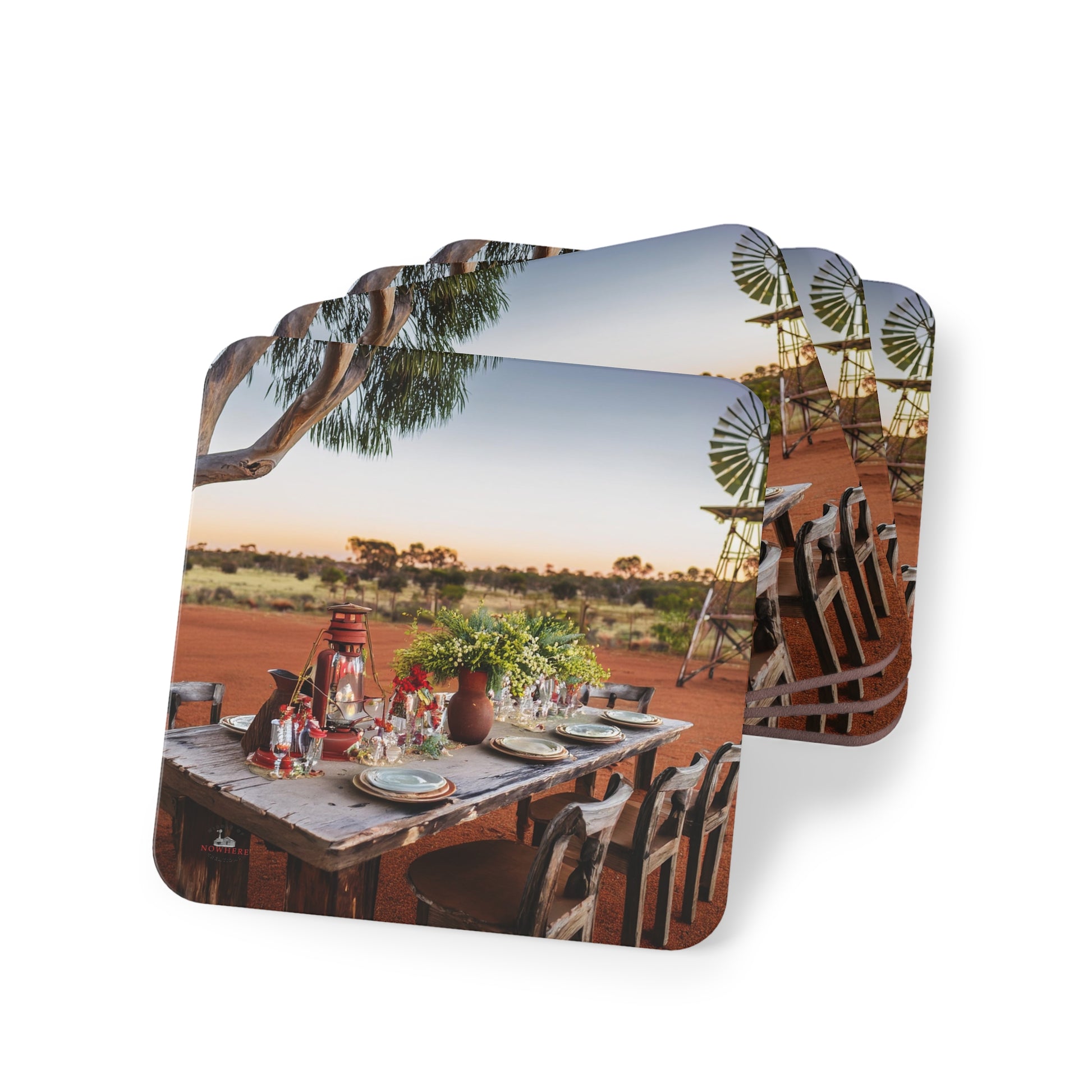Bring the charm of a timeless holiday gathering to your table with our Carmen's Christmas Coasters. This beautifully rustic setting features an antique wooden table adorned with nostalgic Christmas decorations, including vintage lanterns, old vases, and a classic dining set. The scene captures the warmth of a holiday feast, with the table surrounded by antique wooden chairs and set against a picturesque twilight sky, complete with an iconic Australian windmill in the background.