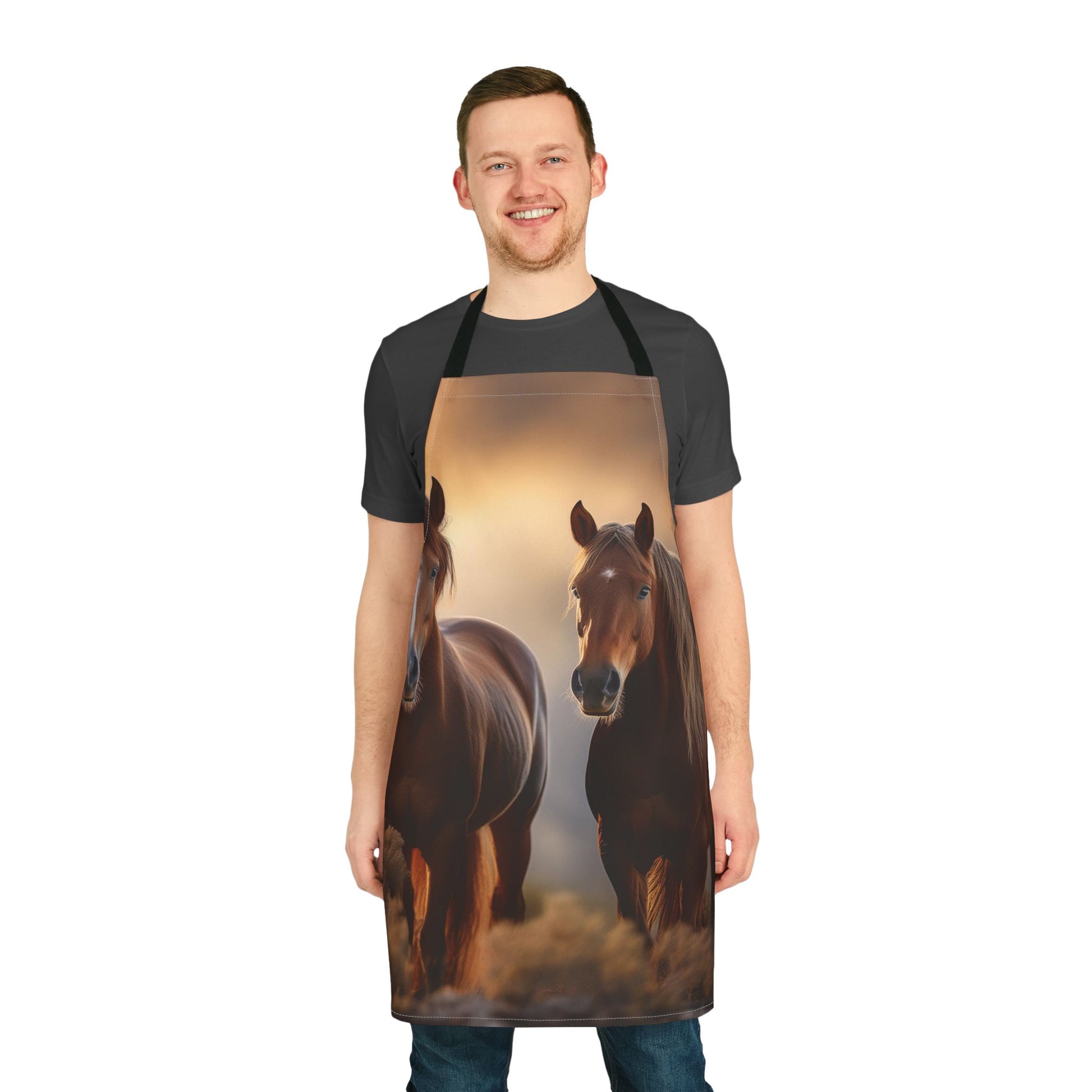 This apron evokes a sense of tranquility and timeless bond between these majestic creatures, making it a perfect choice for those who appreciate the quiet strength of nature. The gentle hues and soft fog create a peaceful, harmonious vibe that complements the powerful imagery of the horses.