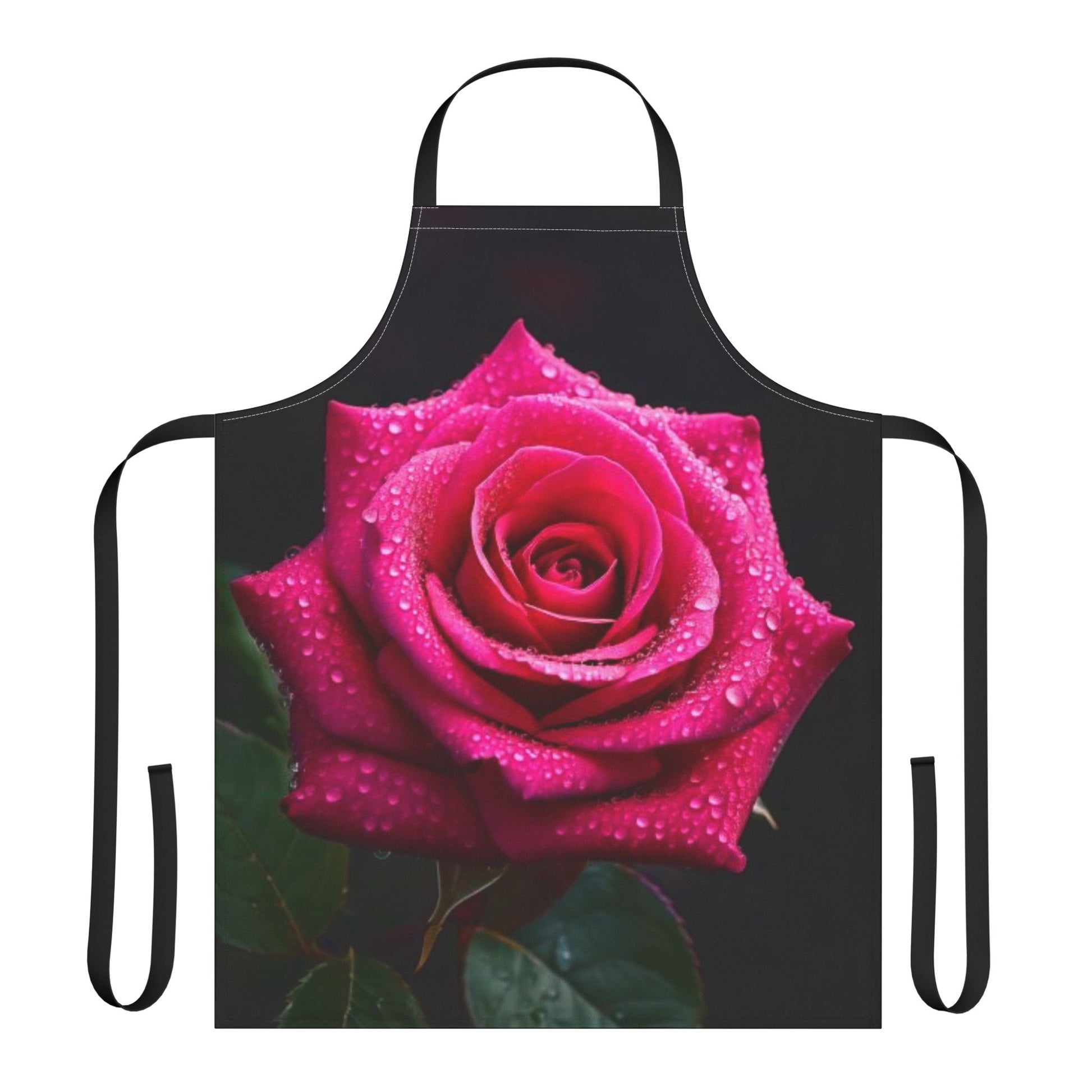 Graceful, refined, and beautifully bold—the Gracie Apron is a striking piece that brings timeless floral elegance to your everyday moments. Showcasing a deep, rich pink single-stem rose, this captivating design features dewy water droplets glistening on the rose petals, adding a layer of freshness and realism to the imagery. A few delicate green leaves frame the bloom, while the black background creates stunning contrast, allowing the rose to truly stand out in all its glory.