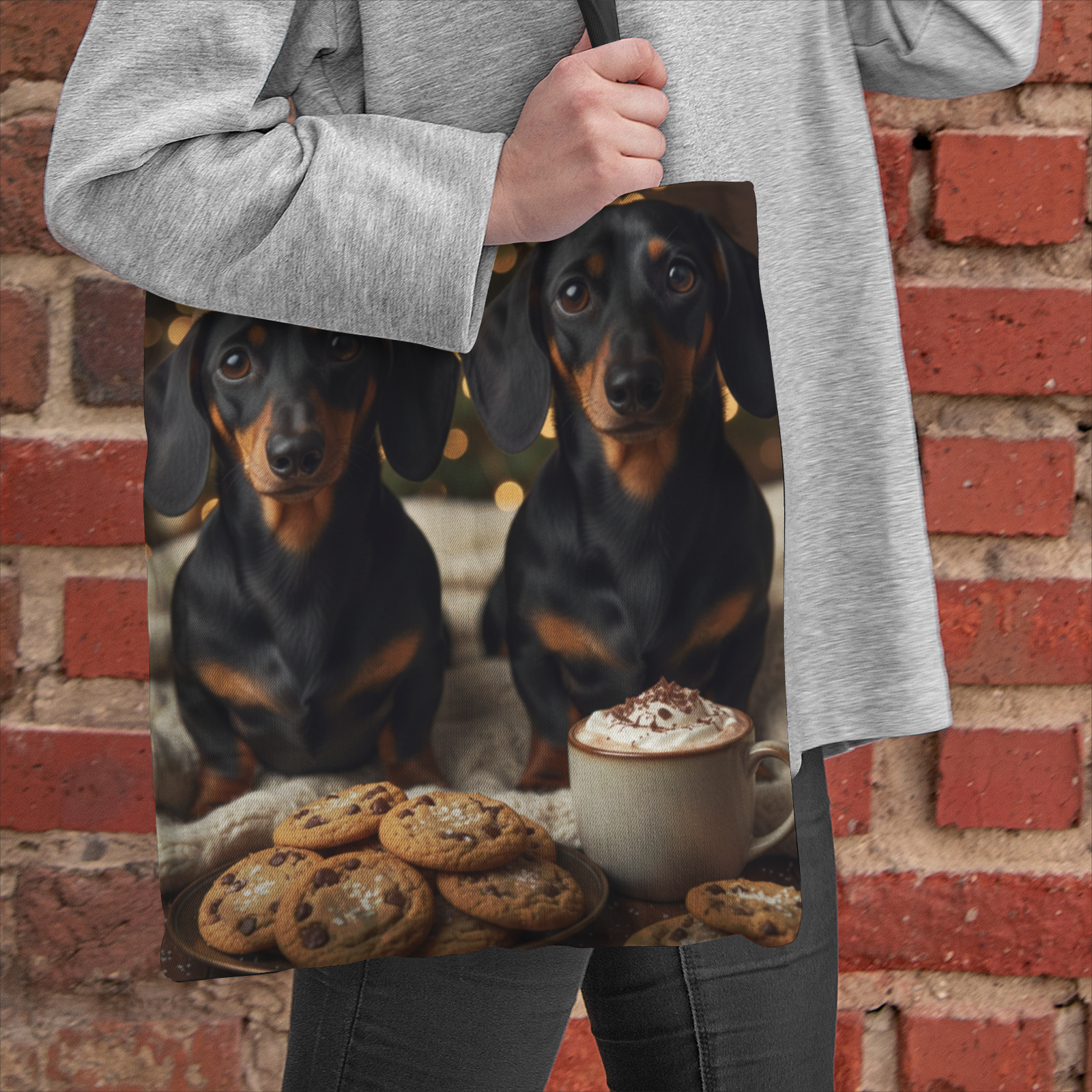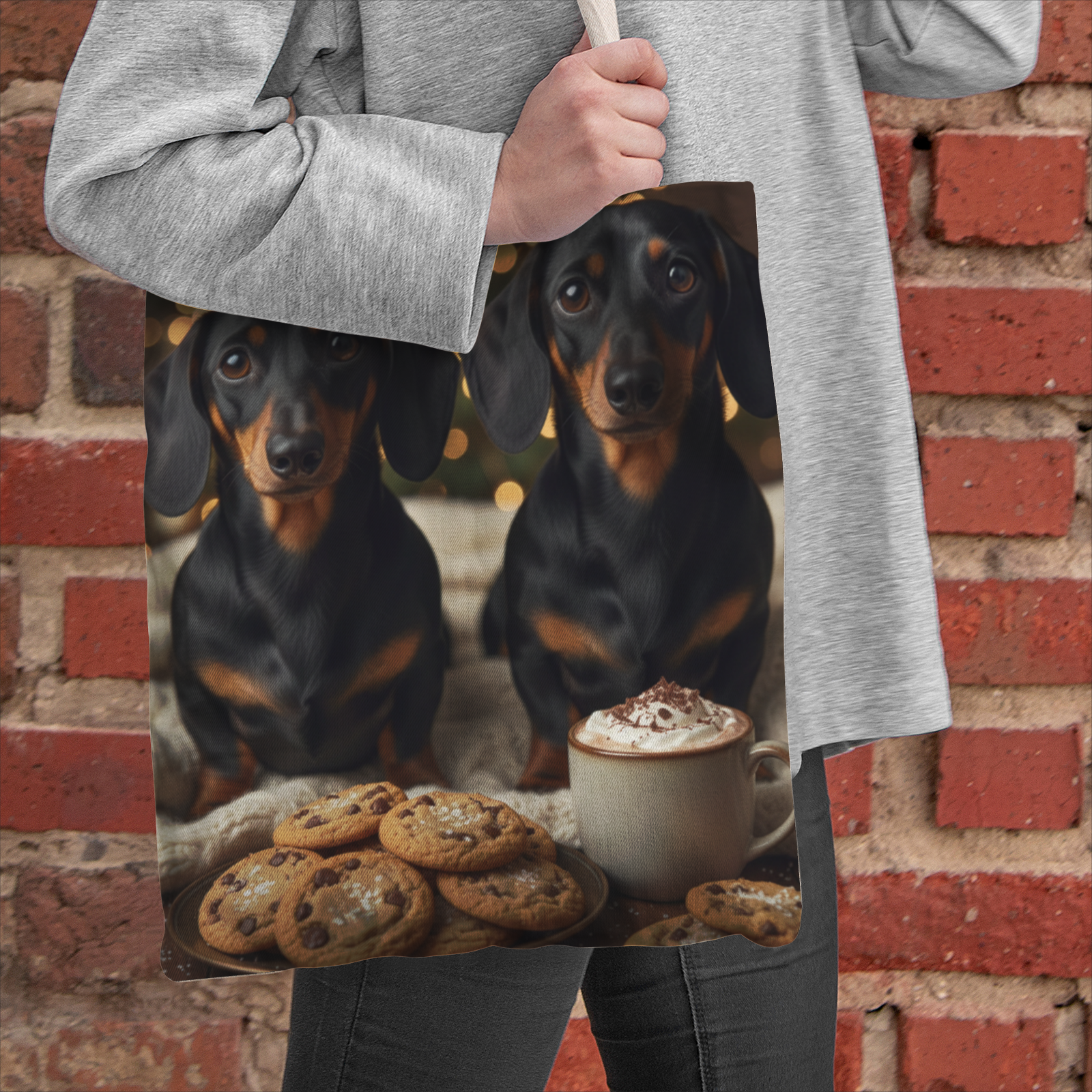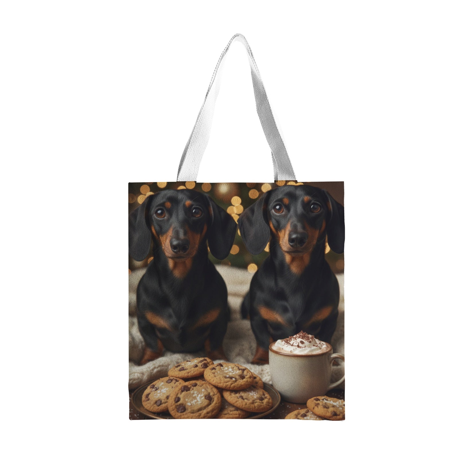 Bring festive warmth and charm to your day with our Isla Natural Canvas Tote Bag. This heart-warming design features two adorable black-and-tan dachshunds sitting side by side, their soulful expressions melting hearts. Nestled against a soft cream-colored knit blanket, they are joined by a cozy mug of cocoa and freshly baked chocolate chip cookies in the foreground. The softly blurred background glows with golden holiday lights, creating a serene, celebratory atmosphere full of seasonal cheer.