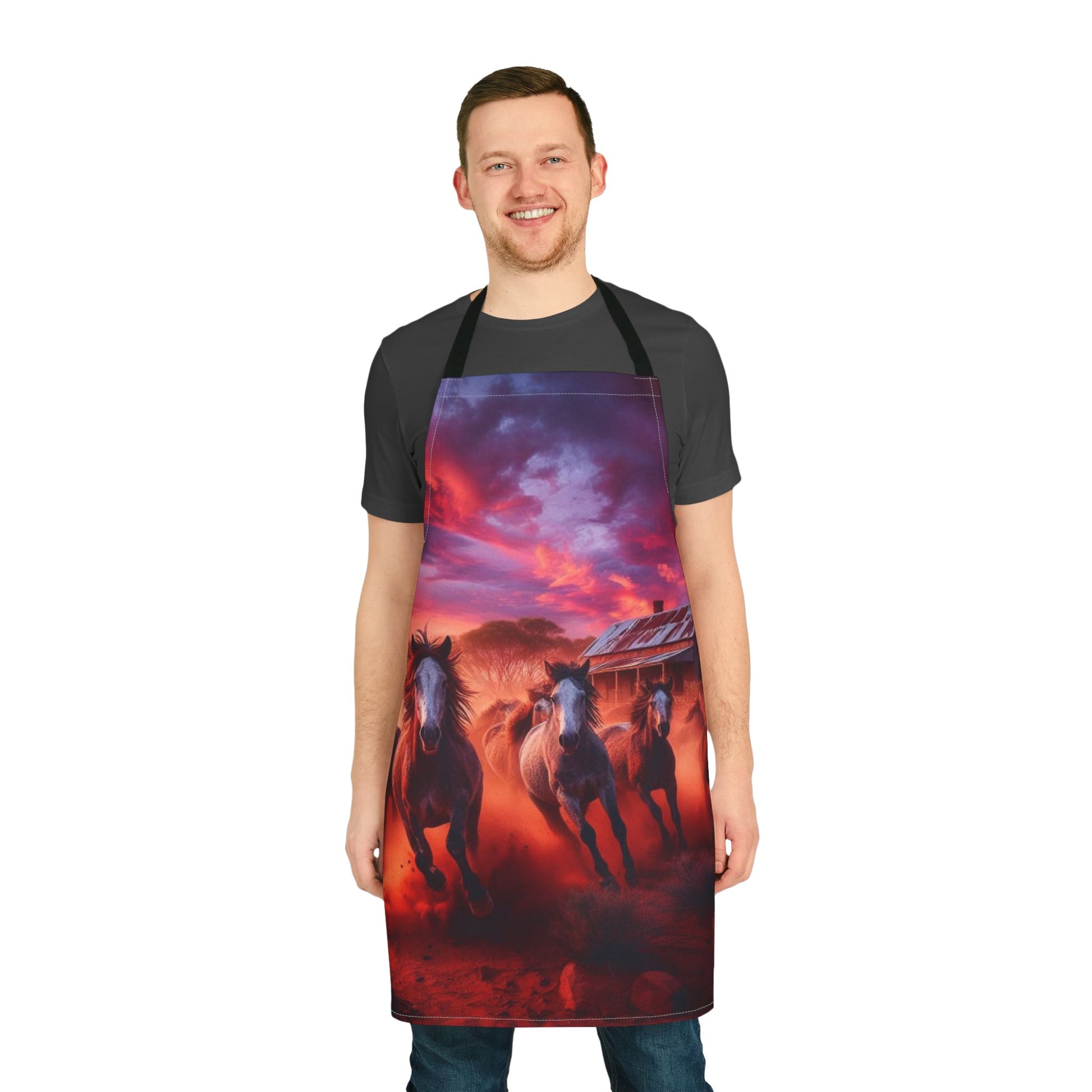 Embrace the spirit of freedom with the Running Free Apron, featuring a stunning image of a mob of wild horses galloping across the open land. The vivid scene captures the raw beauty of nature, with the horses running free beneath a sky ablaze with pinks and oranges, and dust swirling from their hooves. In the distance, an old-timers hut stands as a reminder of the untamed Australian outback.