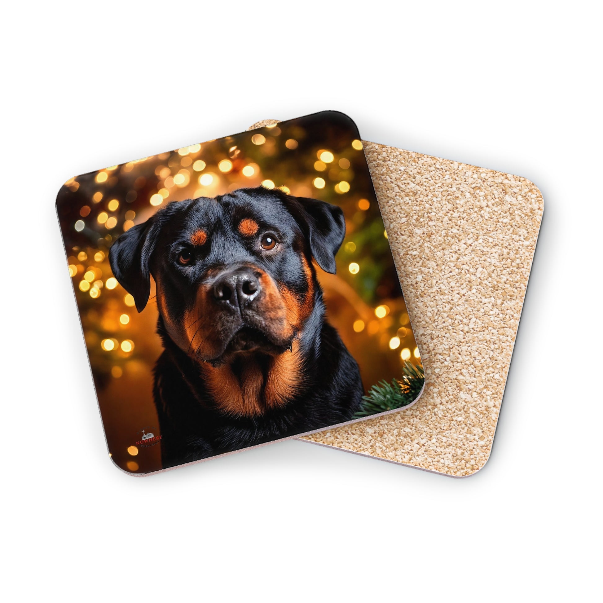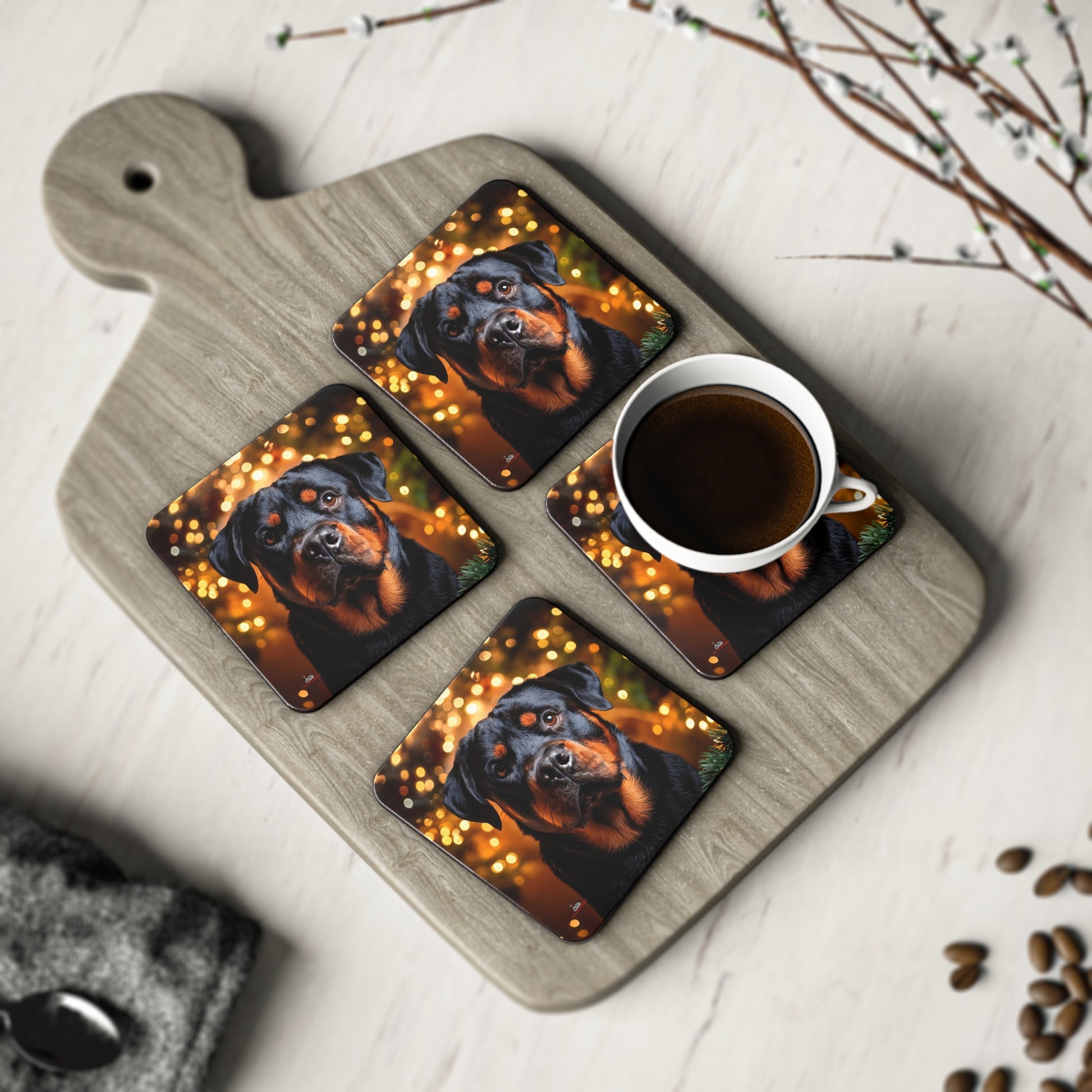 Celebrate the festive season with Zara's Christmas Coasters. This delightful set features a beautiful Rottweiler named Zara, looking directly at the camera with an expression that captures the warmth of the holidays. In the background, the gentle glow of Christmas lights and the lush leaves of a Christmas tree create a charming holiday atmosphere.